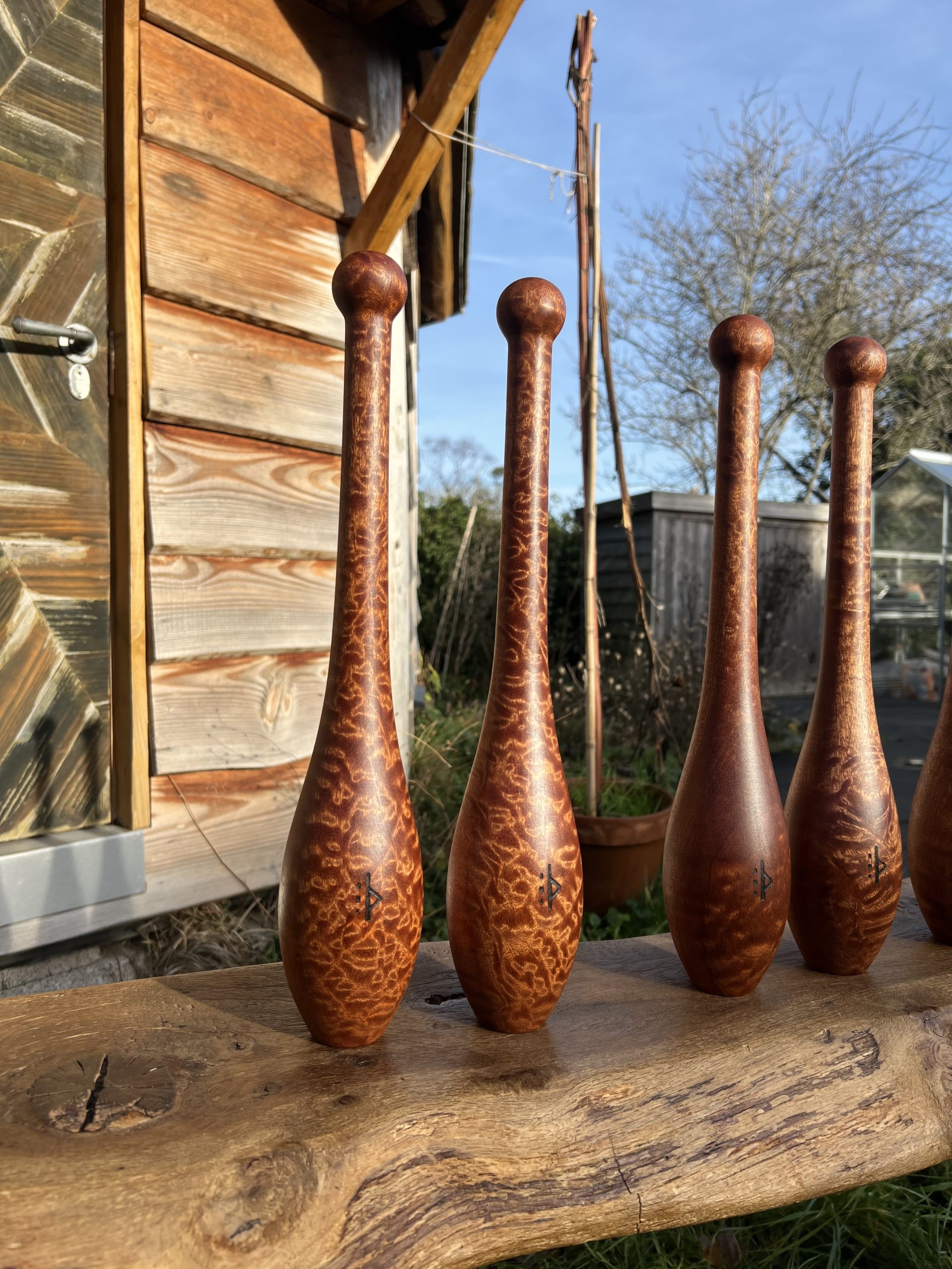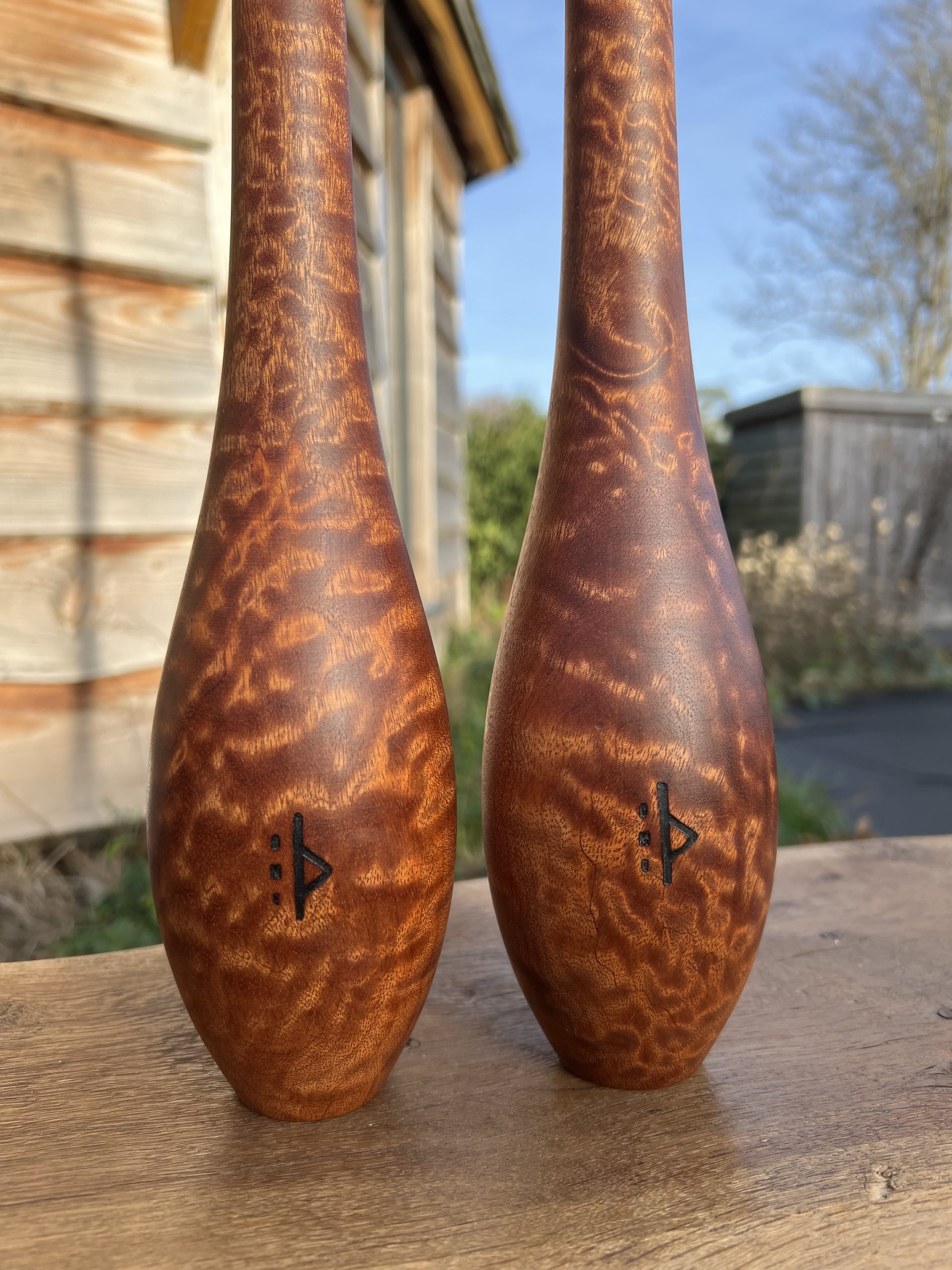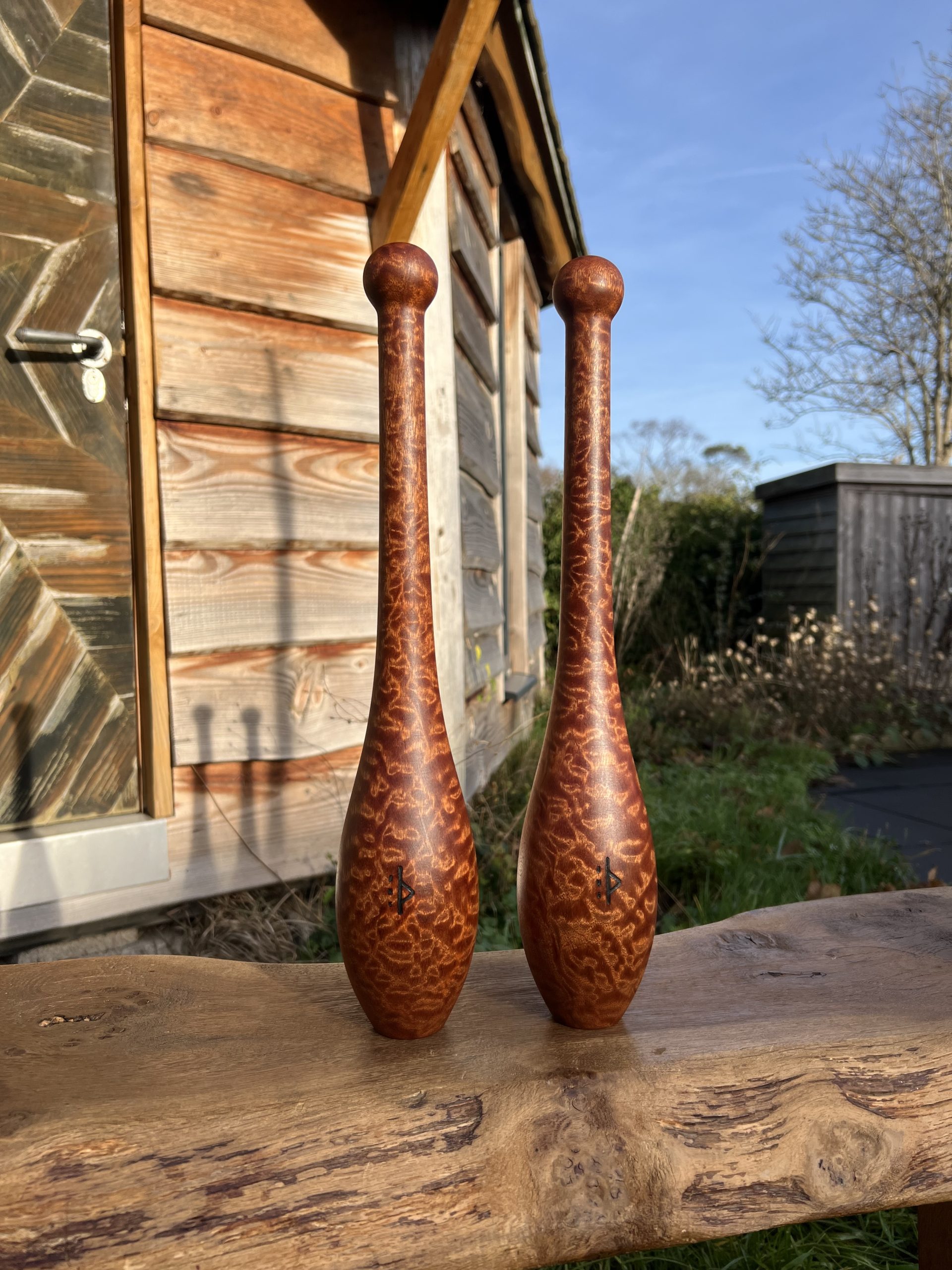 Pair of small Spalding ES1 Starter Indian Clubs – hand-turned from a rare piece of exceptionally quilted sapele hardwood.