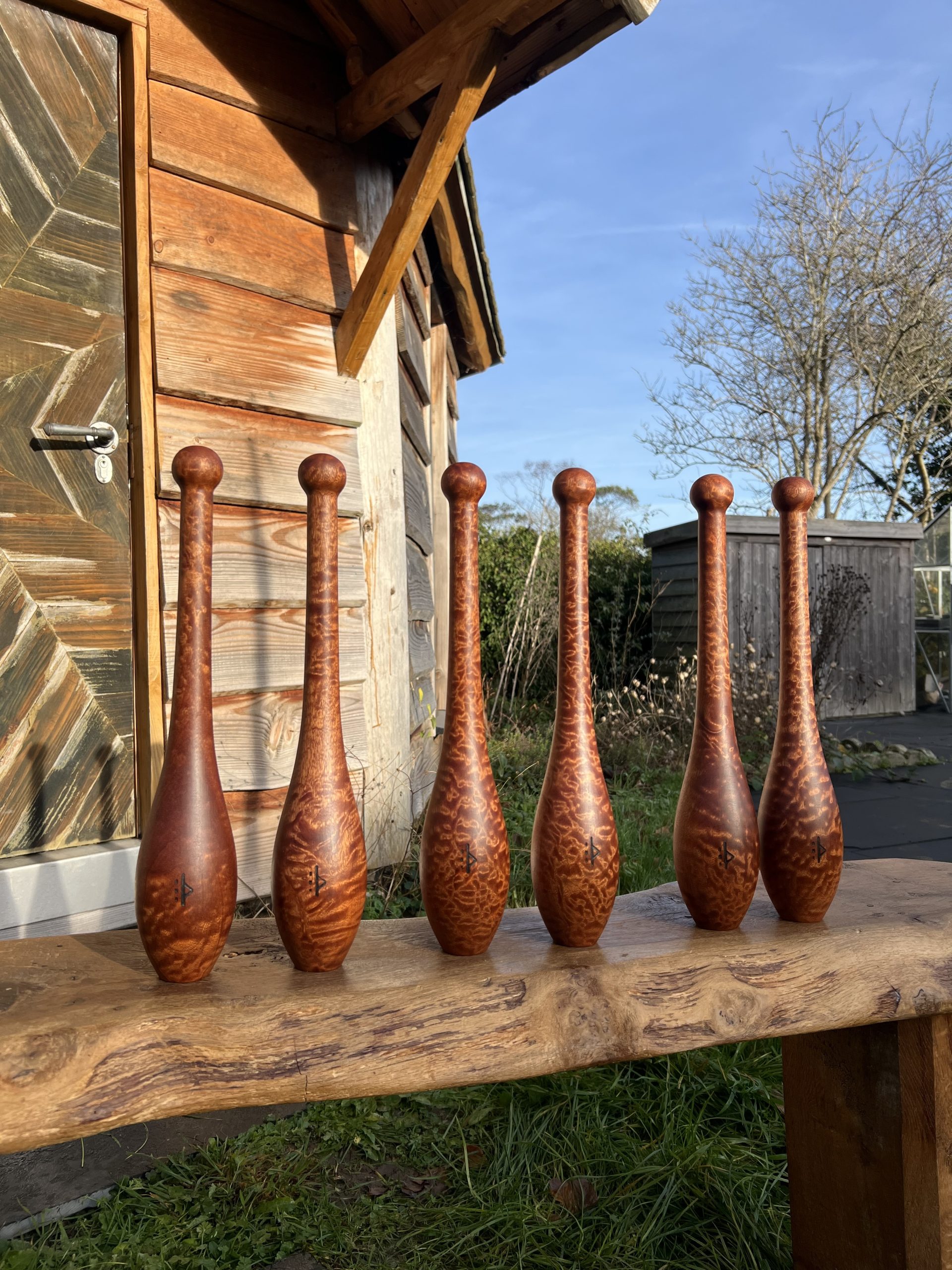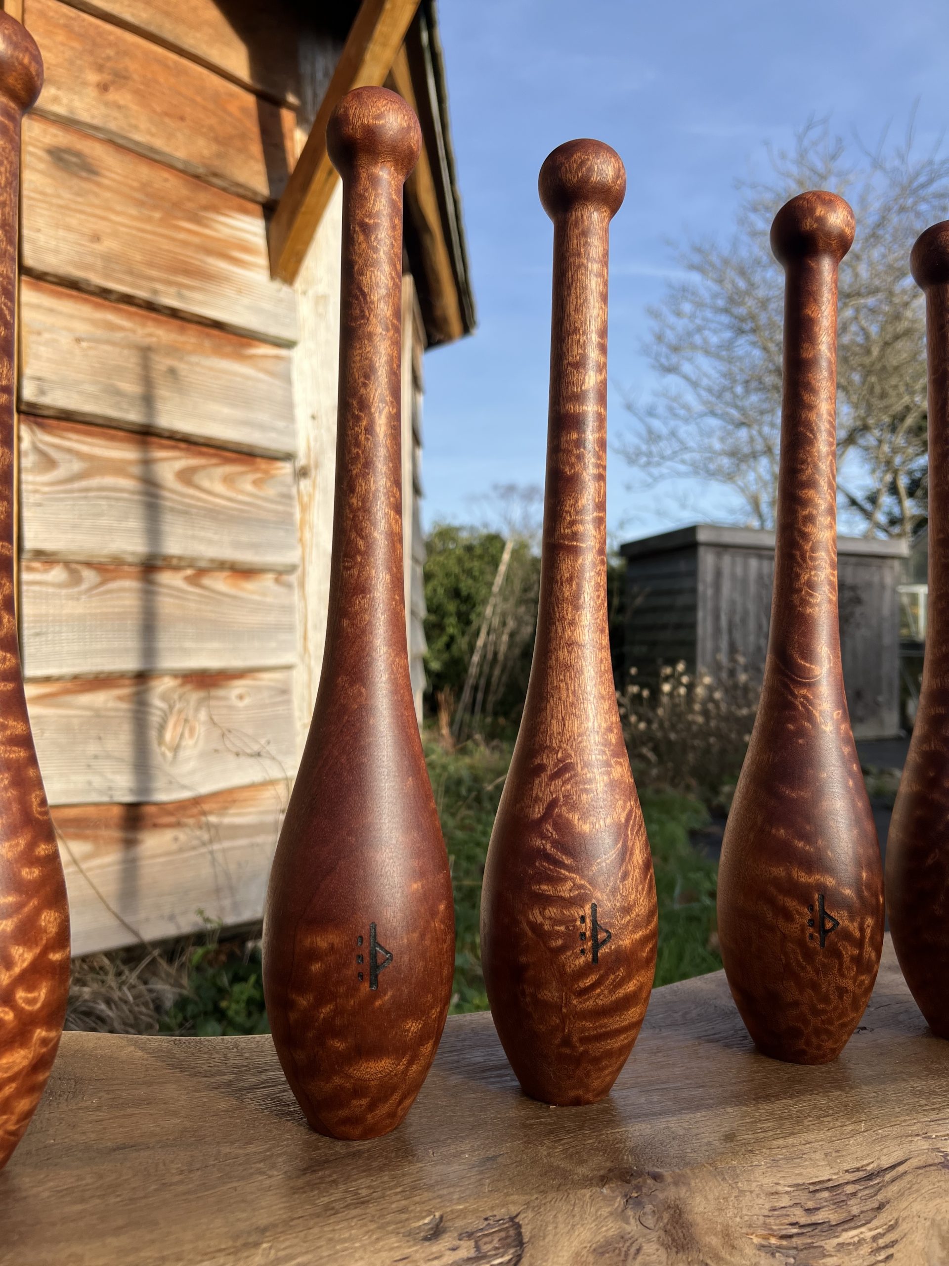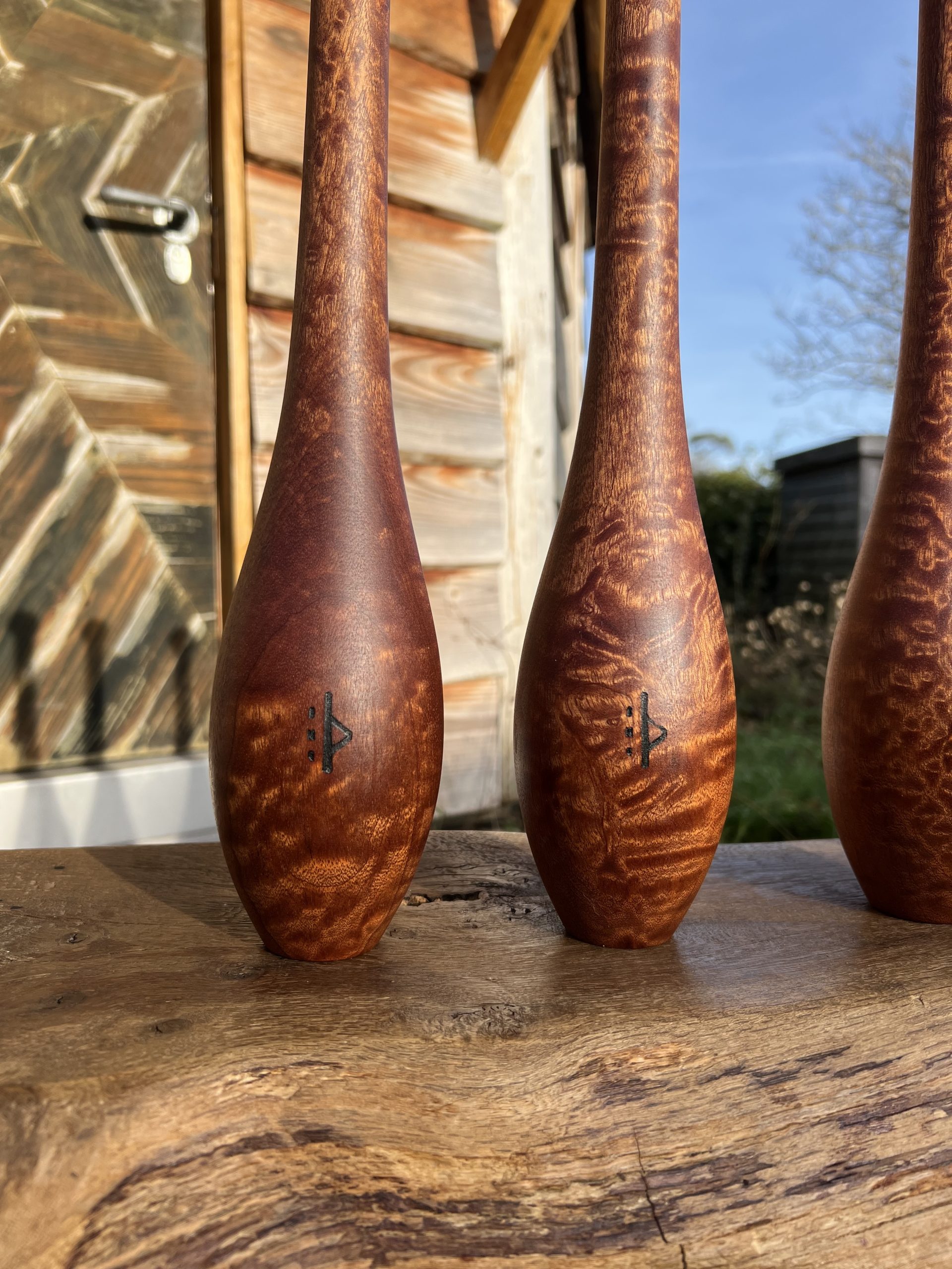 Pair of small Spalding ES1 Starter Indian Clubs – hand-turned from a rare piece of exceptionally quilted sapele hardwood.